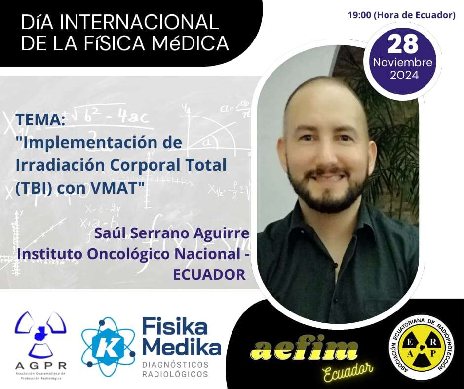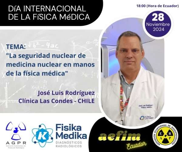 Con motivo de celebrar el Día Internacional de la Física Médica 2024, la Asociación Ecuatoriana de Física Médica – AEFIM, la Asociación Guatemalteca de Protección Radiológica – AGPR y la Asociación Ecuatoriana de RadioProtección – AERP, con el apoyo de Fisika Medika – Diagnósticos Radiológicos invitan a participar en la: